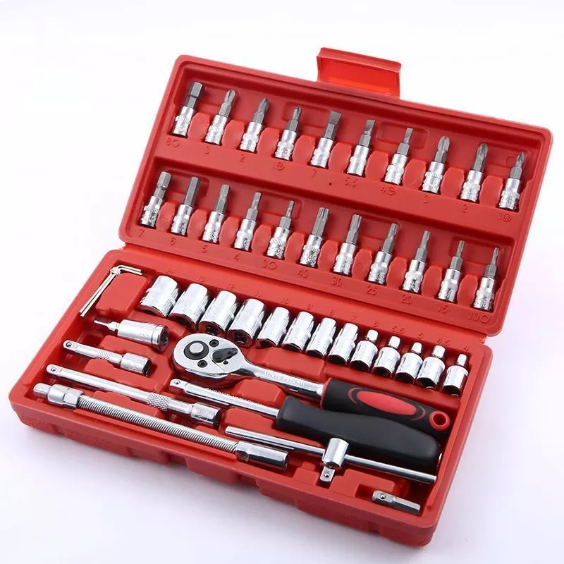 -O kit de ferramentas com 46 peças é uma maleta com ferramentas uteis para manutenções que podem ser feitas em ambiente doméstico, para veículos, motocicletas e outros.