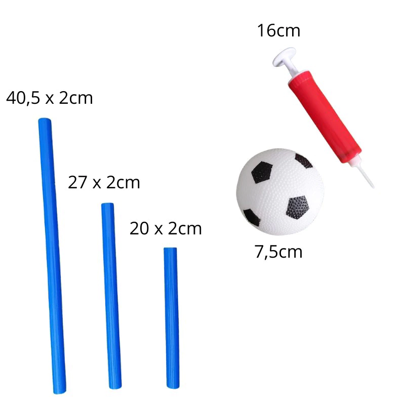 Dimensões: TRAVE – 44cm x 31cm x 24cm. Bola 7,5cm de diâmetro.